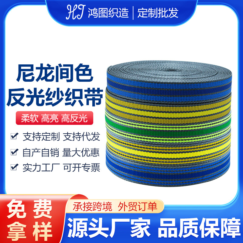 采用高反光材质缝纫到织带上,不会脱落,反光效果好