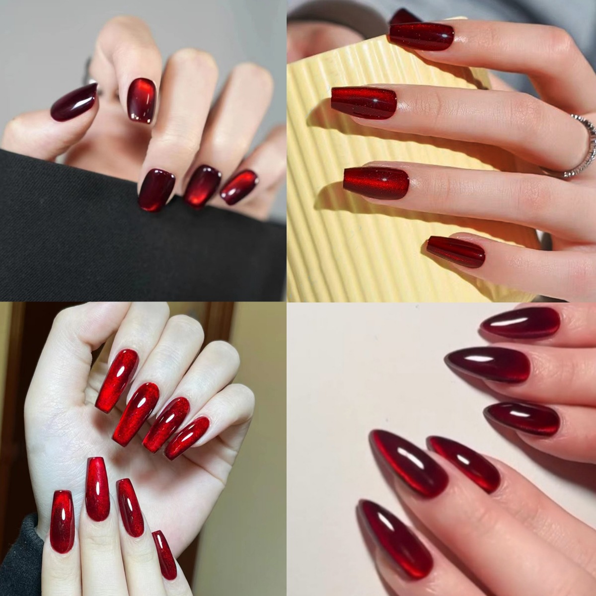 深紅チェリーレッドキャットアイウェアラブルネイルチップアーモンドミディアムティアドロップスクエアフェイクネイルハンドメイドネイルチップ