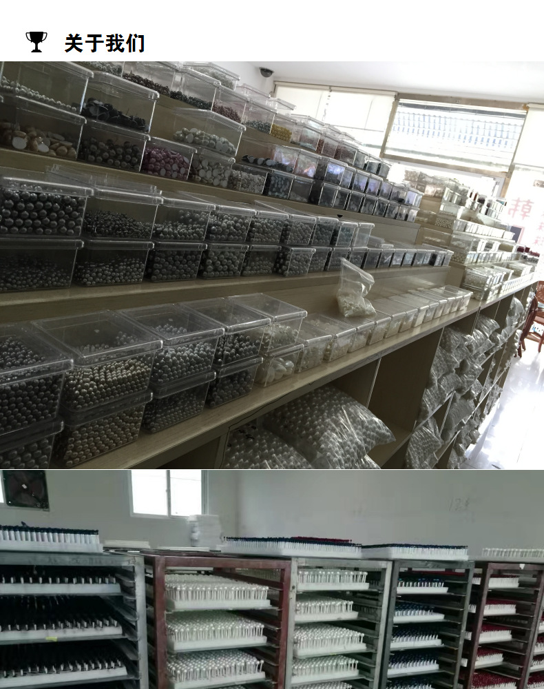 工厂创办于2007年,专业生产高质量品质仿珍珠,品质精良,款式齐全,销售产品有:硬料仿珍珠,高亮玻璃仿珍珠,各种半片异形亚克力及玻璃仿珍珠,款式齐全,其产品优势为:珠子圆润均匀,尺寸较为标准。(如14mm,大小一般为13.9mm-14.1)瑕疵品较少,珠子重量比普通的高亮仿珍珠沉 ,所有产品为相机实拍,不添加任何修饰,给您直观的视觉,您看到的质量就是收到货的品质!!