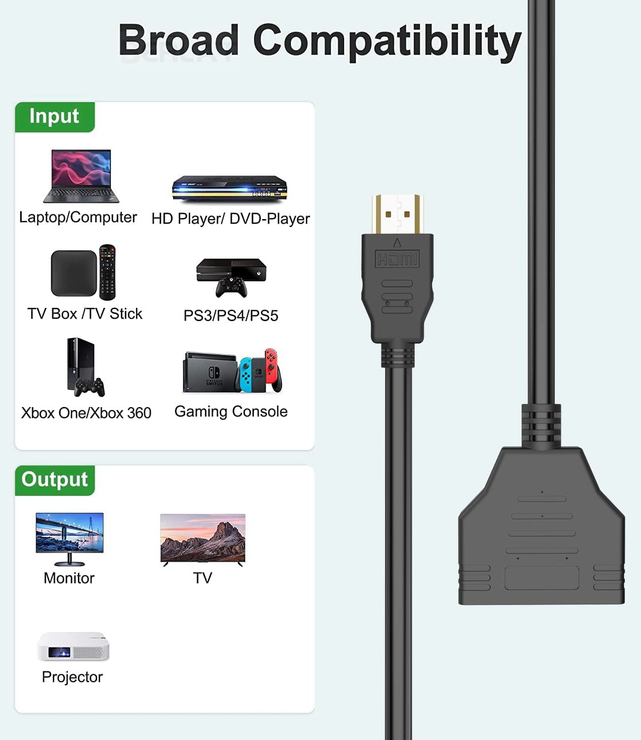HDTV splitter cable is ideal for connecting one HDTV compatible device(such as Xbox,PS3,DVD players,Blueray) to two visual output devices.