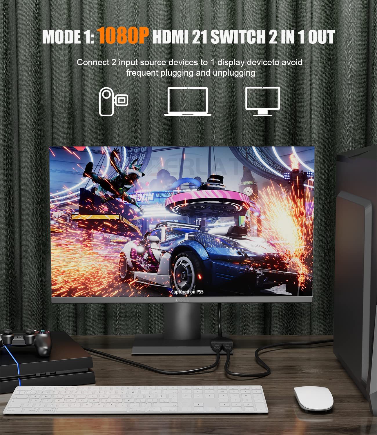 It takes a signal from one device and will direct to one of two output devices that are plugged into it,no need to plug and unplug between two devices anymore.