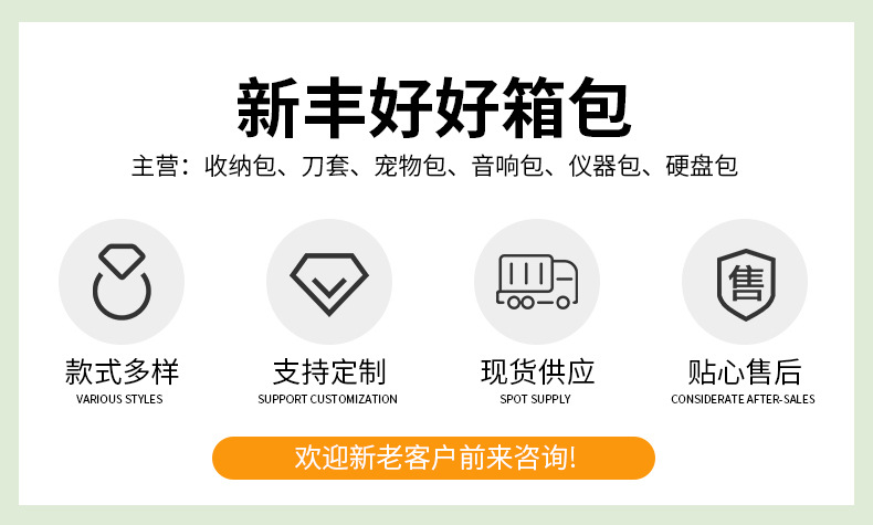 2、本公司分生产与设计两大部门,完全是自产自销,真正的一手货源。无论买家要多少数量,本公司都可以定做,同时上架的很多款式都做了现货库存,因此也支持一件代发。另外,本公司为一线生产厂家,几乎任何款式的箱包均可生产,欢迎广大买家朋友来样来图定做,我们将致力于买卖双方的长久合作!任何不满意,请联系我们!
