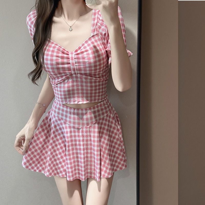 チェック柄水着 レディース スプリットツーピースセット コンサバ 痩身 お腹カバー 若い女子学生 かわいい 温泉水着