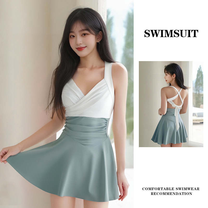 泳衣女2025韩系简约ins风连体拼色遮肉显瘦吊带露背裙式温泉泳装