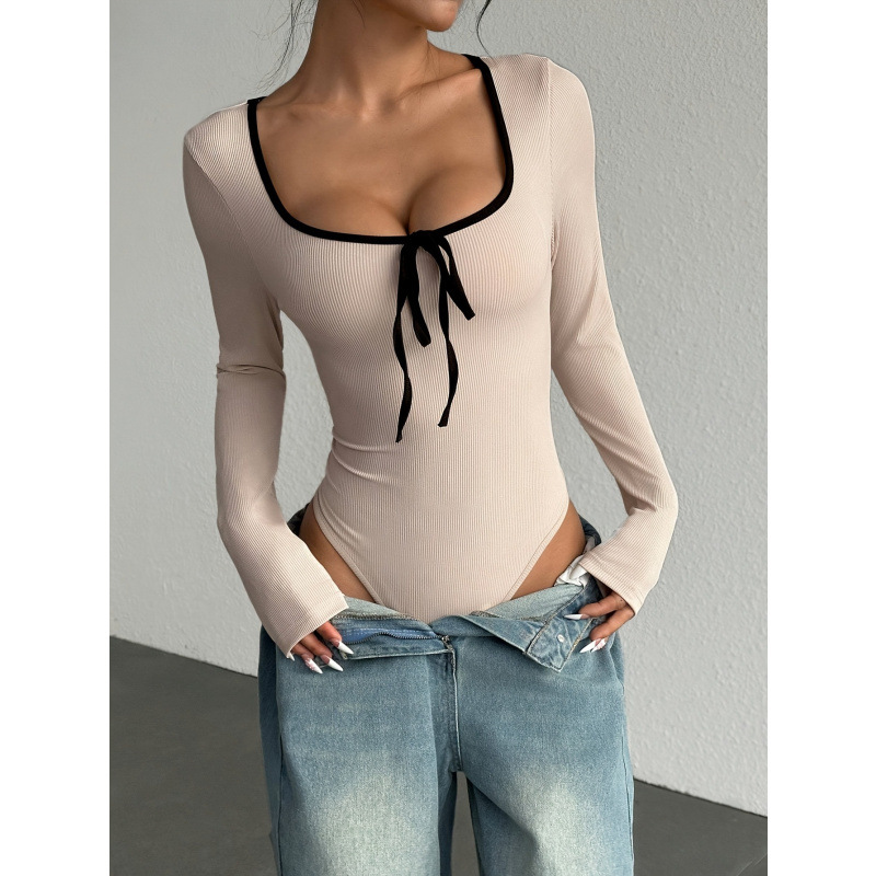 2025春夏独立系クロスボーダーラウンドネックリボンカラーブロック長袖ジャンプスーツ