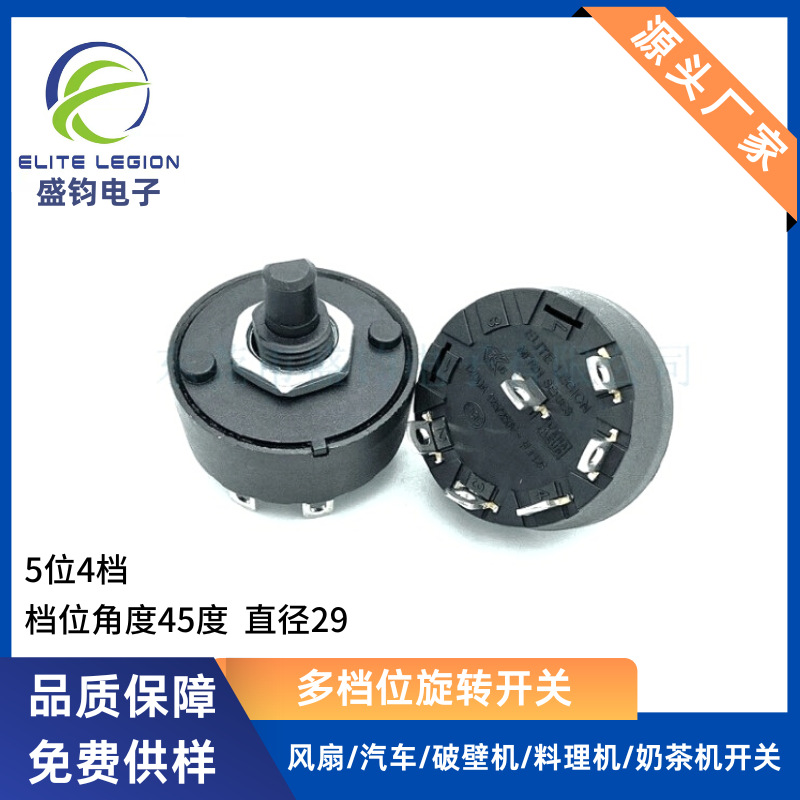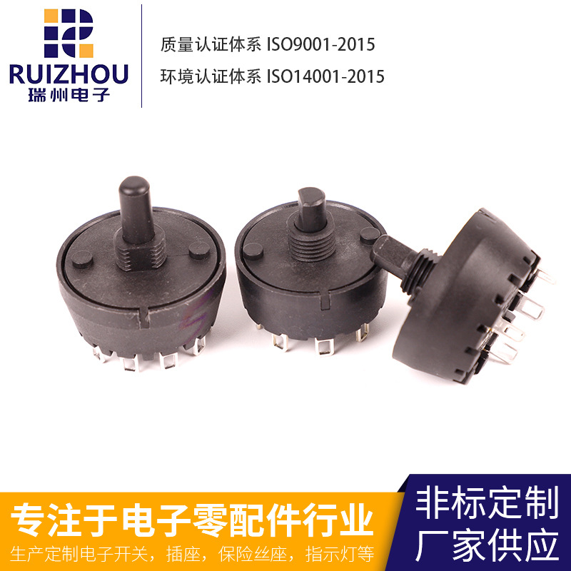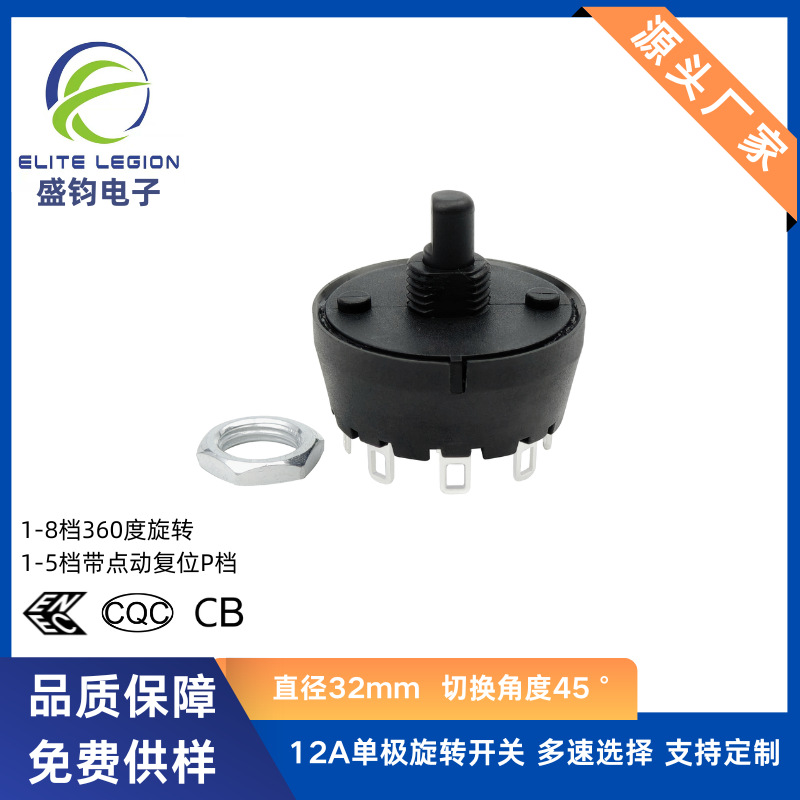 此款开关可用于料理机、破壁机、碎冰机、绞肉机等等...MFR01-A1系列直径32mm,旋转角度36度,固定孔距22mm,最多可做10档360度旋转,点动功能可做到7档带点动。