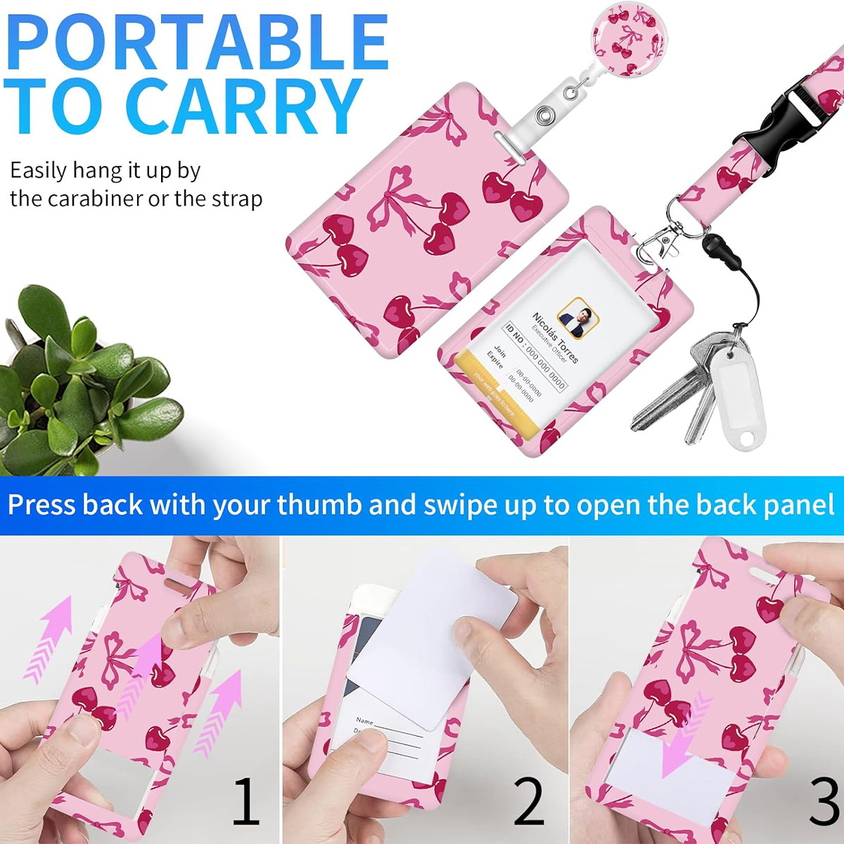 新款樱桃滴胶易拉扣 双面uv印卡套带可拆卸挂绳蝴蝶结钥匙扣防丢