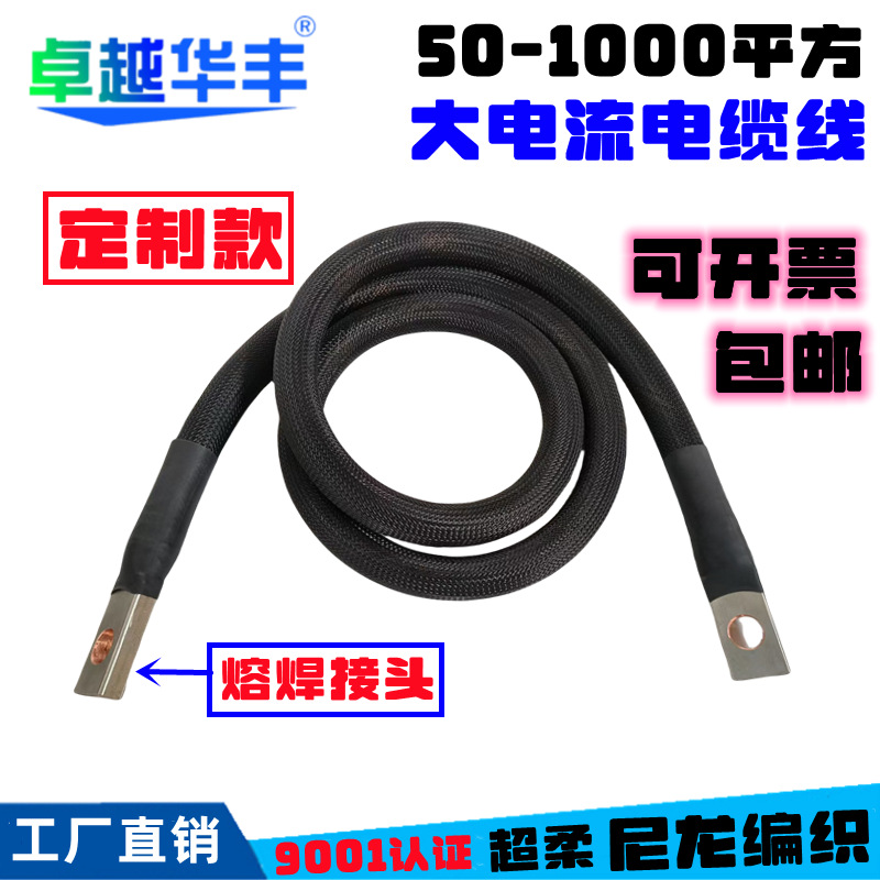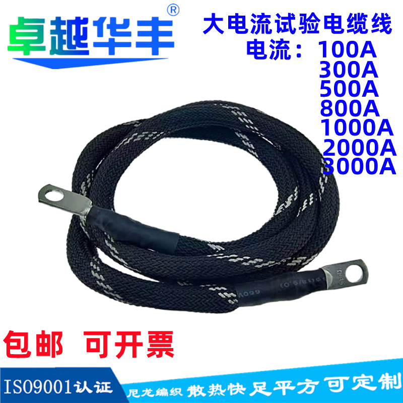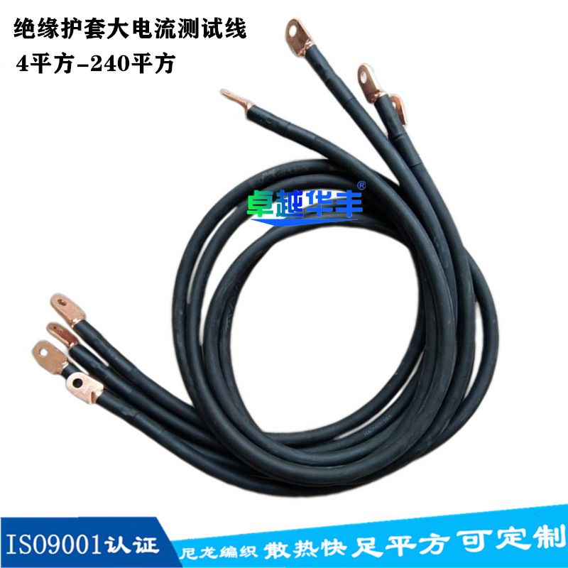 2.大电流电缆由导线和接线端两部分组成,压接联接,大电流导线芯用多股铜丝绕制,每股直径为0.15mm;大电流导线表皮为锦纶编织的绝缘保护套,大电流导线的长度和接线端的形式可按用户要求加工。具有外形美观、安全可靠、质地柔软、耐磨耐高温等特点。该大电流导线,电流实验导线电流密度为5A每平方毫米.