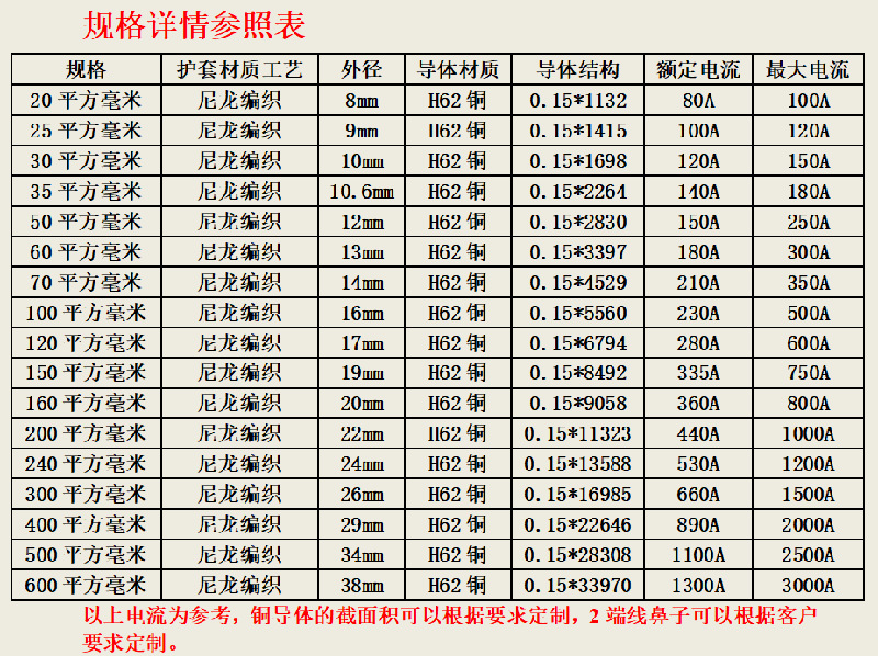 大电流试验电缆采用φ0.15的铜丝,尼龙编织,具有通过的电流大,柔韧性好,散热快等优点。