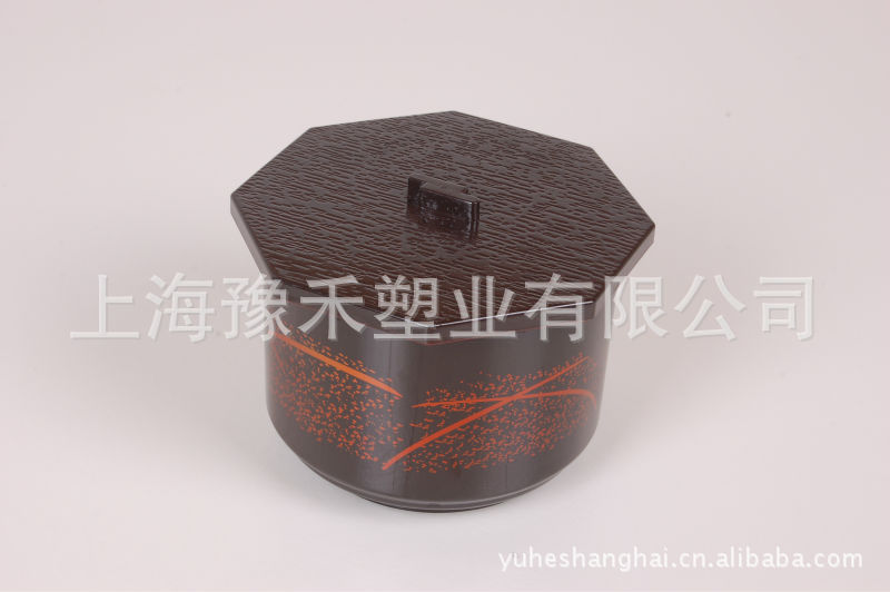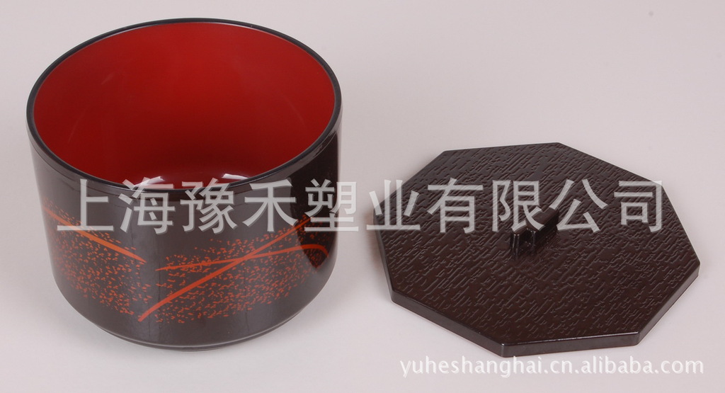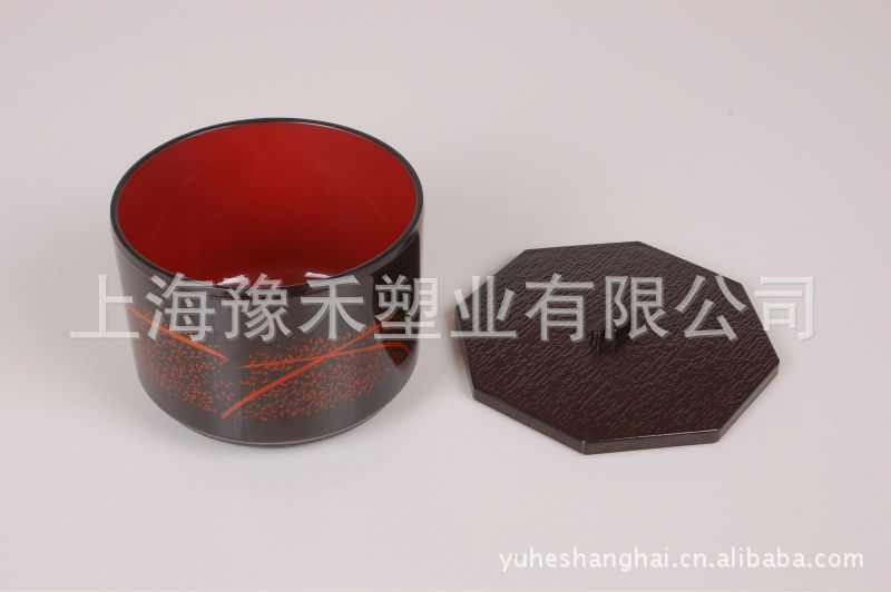 产品味日式味增碗,双色制作,产品的材料为ABS塑胶,外部烤漆印花处理,盖子为八角形,碗内红色!