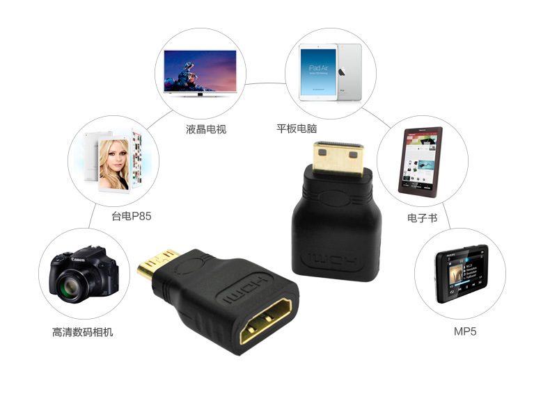 hdmi转mini hdmi转接头,采用高纯度铜芯,信号传输稳定,突破了传统音、视频信号独立传输的局限性,成功实现了音视频 一体化同步传输,适用于所有带Mini HDMI接口的设备连接HDMI接口的显示设备.