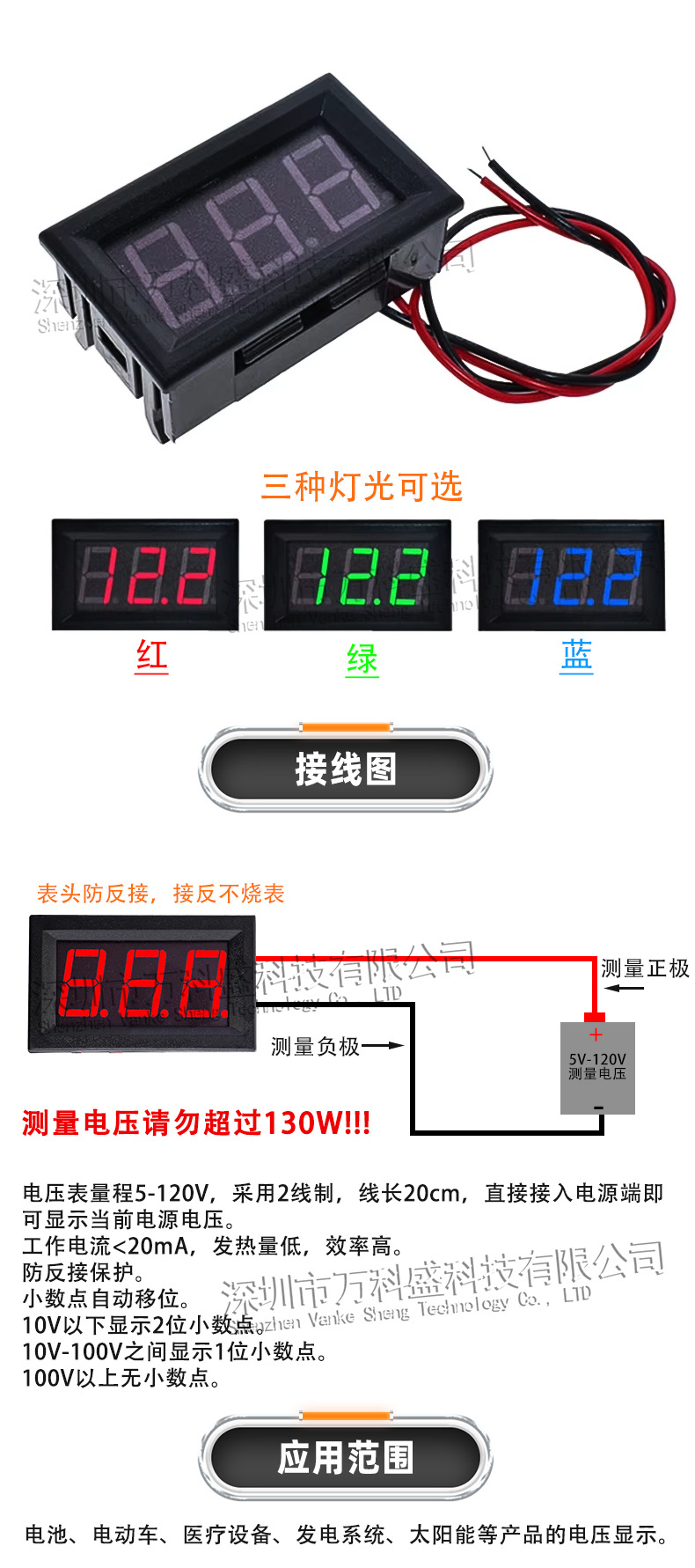 2線DC5V-120V直流デジタル電圧計デジタル電圧表頭電気自動車表頭反接防止0.56