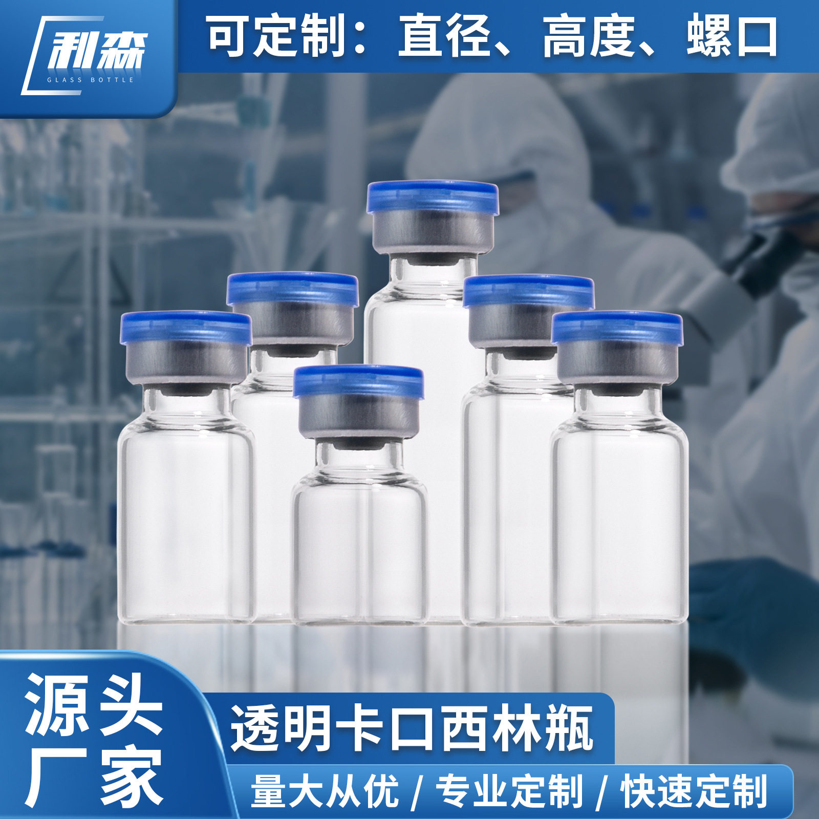 源头厂家各种容量款式现货批发可定直径螺口高度透明卡口西林瓶