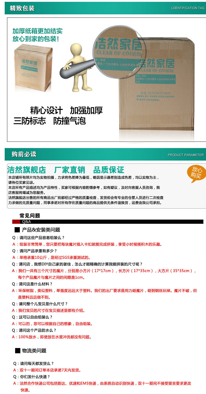 1.该款产品采用的是轻便环保的PP材料,防潮,耐污,拆卸自由,组装简单,清洁便利(温水抹布一擦即可,如果是顽固污渍可以适当使用一些如洗洁精类的清洁剂擦拭)。