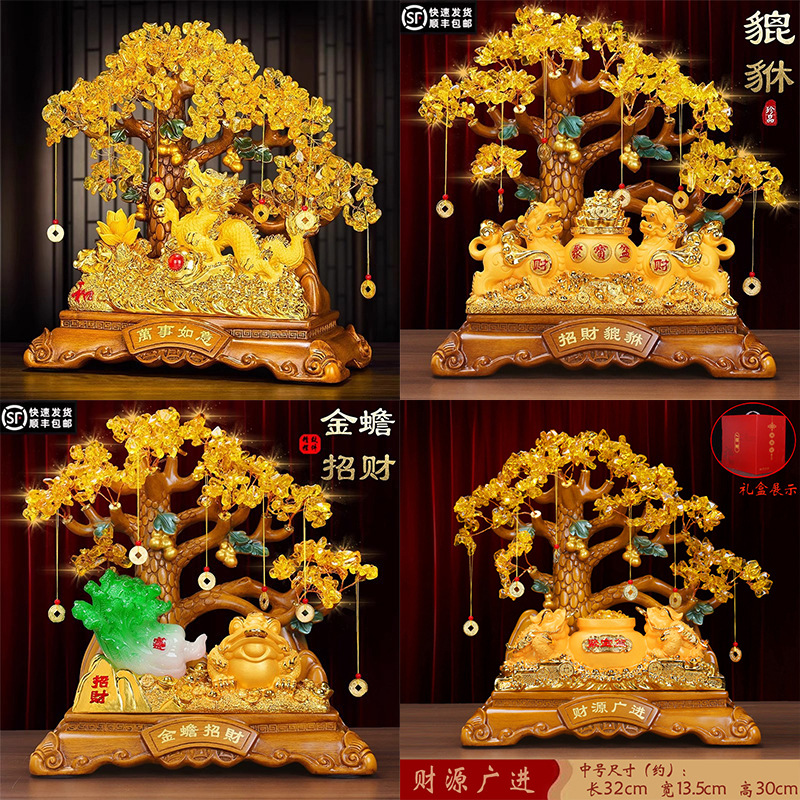 招财猫摆件黄水晶发财摇钱树办公室收银台饭店高档大气开业礼物