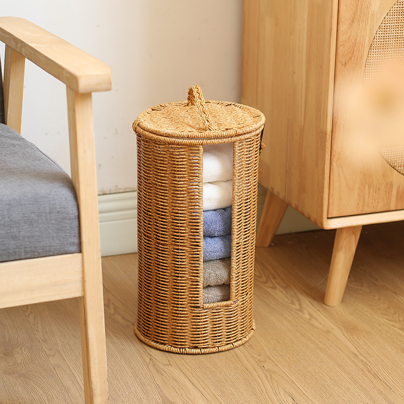 籐編みの丸いバケツに蓋付き収納かごホテル民宿タオルバスケット家庭用トイレットペーパー収納ロール紙筒