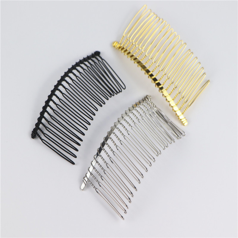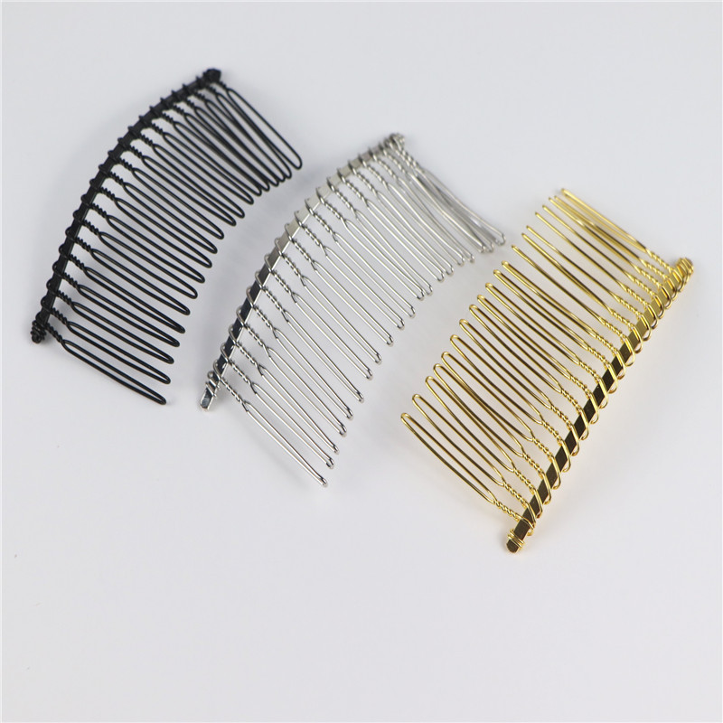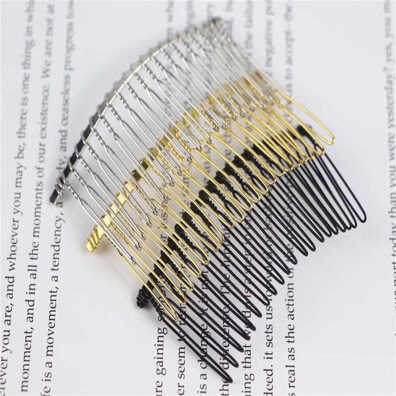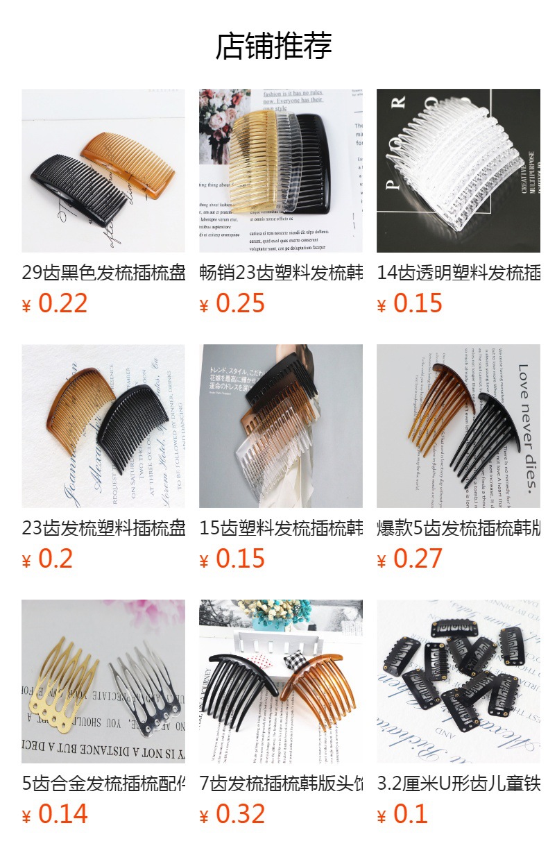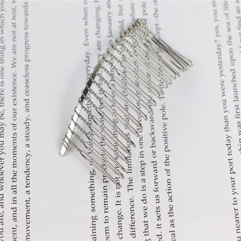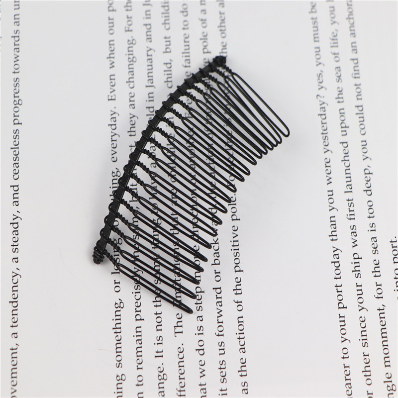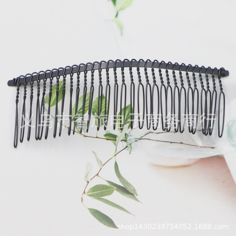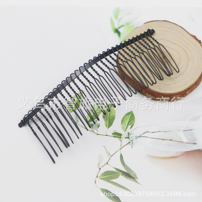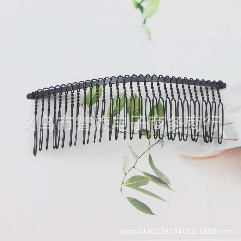 畅销20齿铁丝发梳,长度是8厘米,宽度是3.8厘米,一般是黑色、白K、金黄三个颜色,100个一袋,简易包装,量大可以定做加工。类似的梳子还有10齿的铁丝发梳