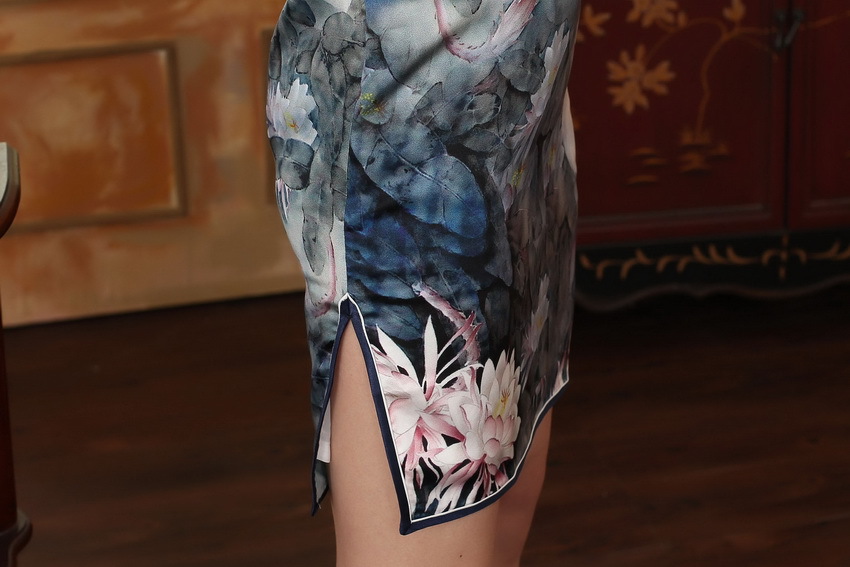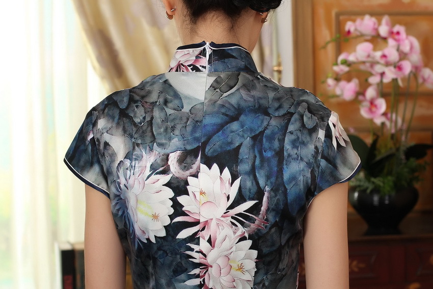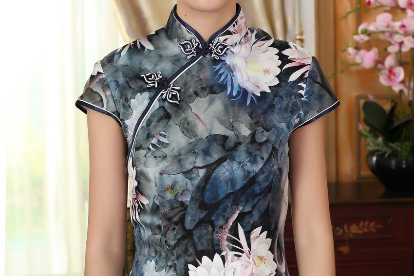 面料:高档数码喷绘弹力缎桑蚕丝面料,亲肤柔软的雪纺内衬,尽显高档旗袍的魅力,后背隐形拉链款,真丝旗袍非常养肤,入手柔爽,顺滑,有着良好地吸湿,散湿和透气性能,可以保持皮肤滋润,光滑