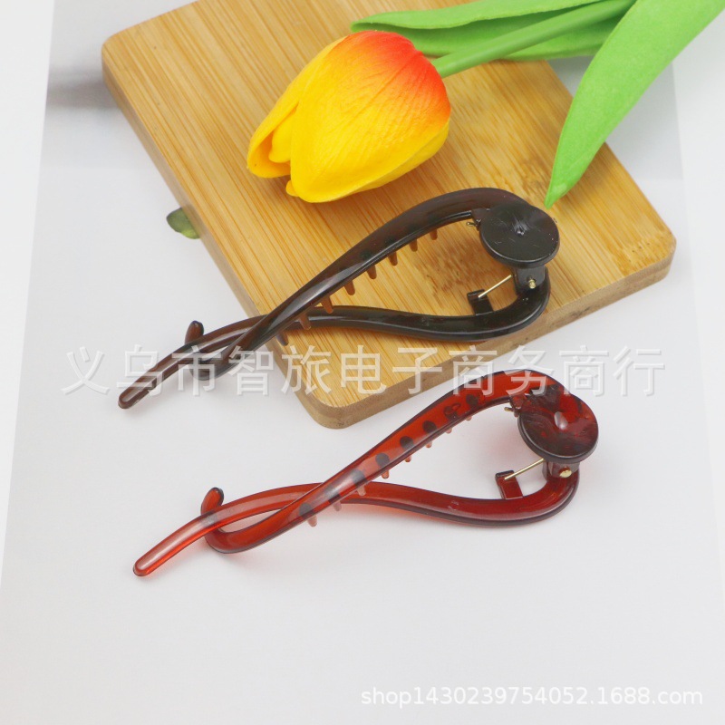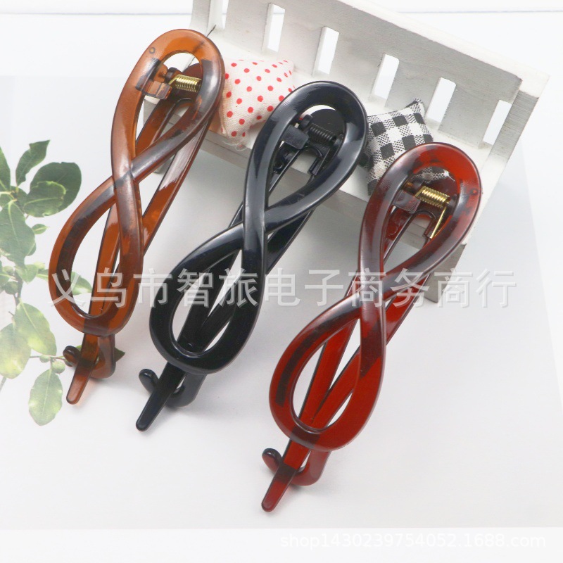 畅销韩版优质塑料扭夹,长度是10厘米,宽2.7厘米,有黑色和咖色两种颜色,可以直接用,也可以绕布艺,做成高档发饰,质量好。
