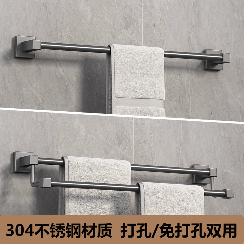 枪灰毛巾架304不锈钢毛巾杆单杆卫生间双杆浴巾架免打孔浴室架子