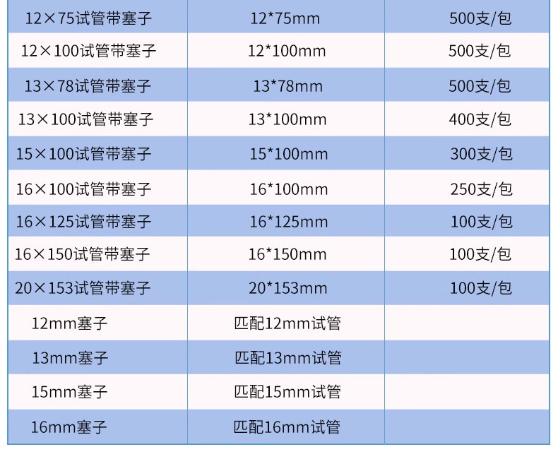 容量 12*60mm(3ml),12*75mm(5ml),12*100mm(7ml),13*78mm(6ml),15*100mm(9ml),15*150mm(13ml),16*100mm(10ml),16*150mm(15ml),20*150(30ml),12*60プラグ付き,12*75プラグ付き,12*100プラグ付き,13*78プラグ付き,15*100プラグ付き,15*150 ストッパー付き,16*100プラグ付き,16*150 蓋付き,20*150蓋付き,16*100カバー (60個/バッグ),12/13mm試験管栓,15/16mm試験管栓,20mmコルク,カスタム木栓