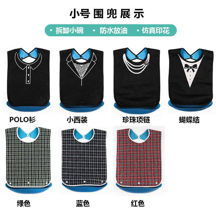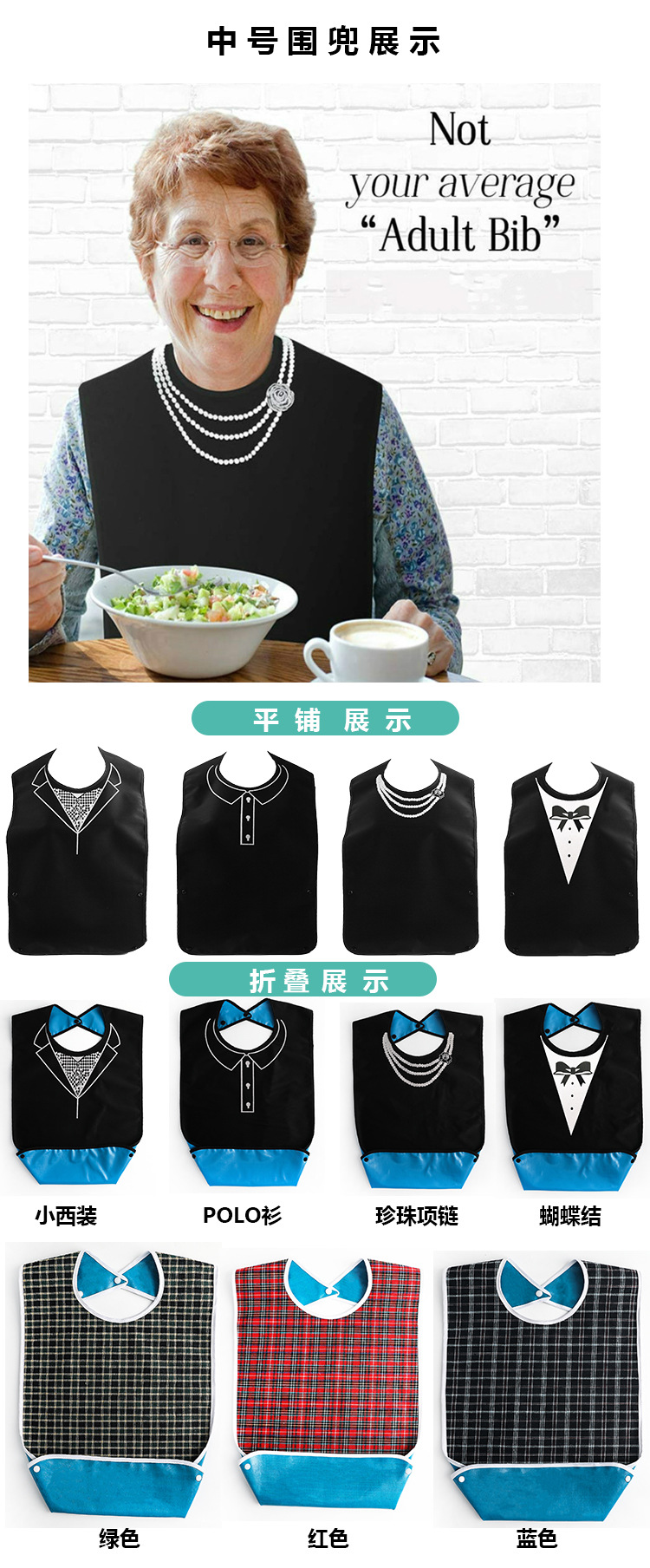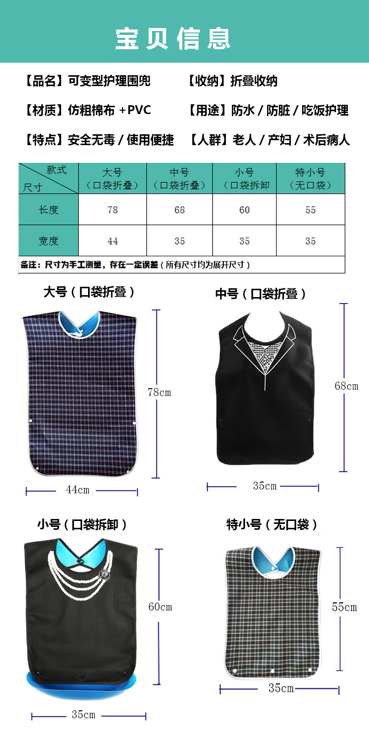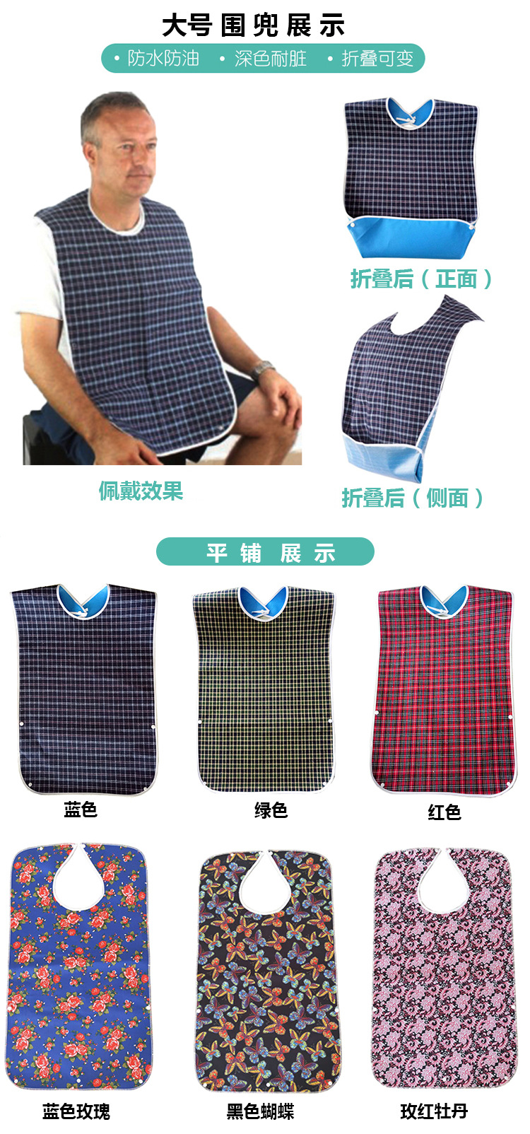 本产品采用优质面料,精心设计制作,围兜下端设有一个小袋子,可以接住吃饭、吃水果时掉下来的饭菜和果汁。脏了用干净的湿布或用水冲一下便可,方便实用。使用本品,能保持衣物整洁,防止食物污染衣物,不易粘油污,容易清洗。领口设计了两颗搭扣,可根据实际随意调节领围大小。腰部有两个固定带,令围兜可与人体更贴合,清爽的面料花型给病人带来精神上愉悦的同时也为护理人员的日常护理工作提供便利。