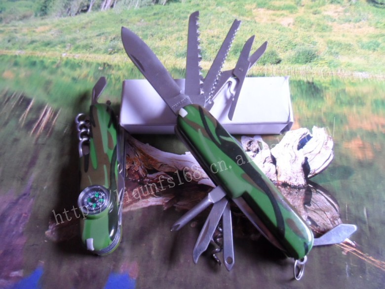 【产品功能】:军刀、木锯、剪刀、小刀、锉刀、剪刀、开瓶器、钻孔锥、指南针、十字改锥、拔木塞钻等...