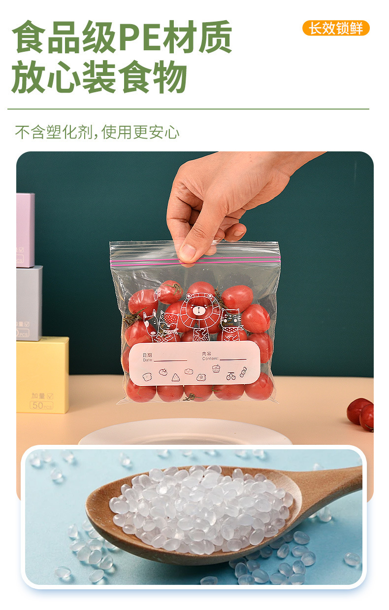 食品グレードの密封袋、冷蔵庫専用保存袋、厚手の食品用ジップロック袋、野菜や果物の鮮度保持袋