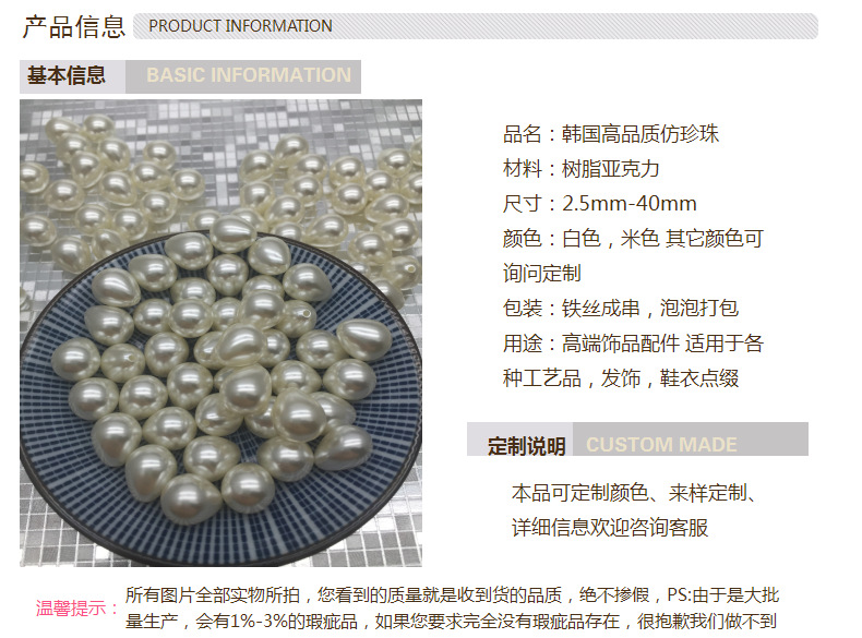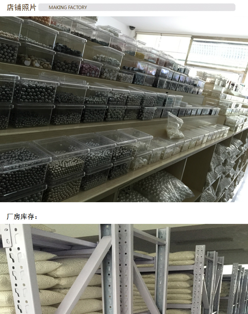 工厂创办于2007年,专业生产高质量品质仿珍珠,品质精良,款式齐全,销售产品有:硬料仿珍珠,高亮玻璃仿珍珠,各种半片异形亚克力及玻璃仿珍珠,款式齐全,其产品优势为:珠子圆润均匀,尺寸较为标准。(如14mm,大小一般为13.9mm-14.1)瑕疵品较少,珠子重量比普通的高亮仿珍珠沉 ,所有产品为相机实拍,不添加任何修饰,给您直观的视觉,您看到的质量就是收到货的品质!!