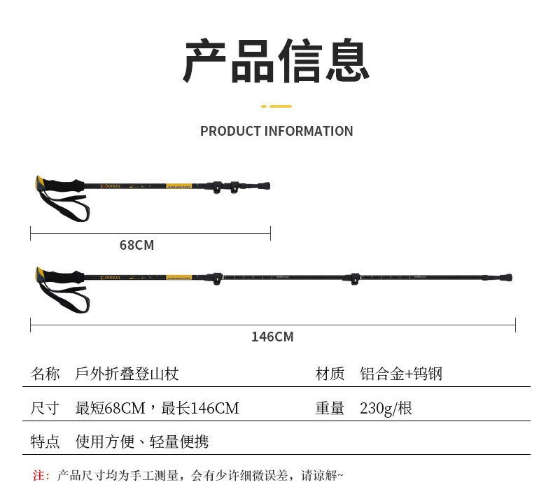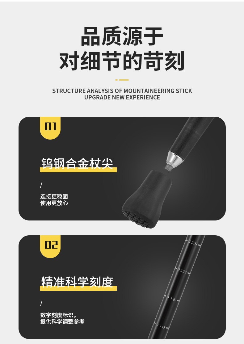【材料】:EVA彩色手柄,7075铝合金杖杆,钨钢脚尖。