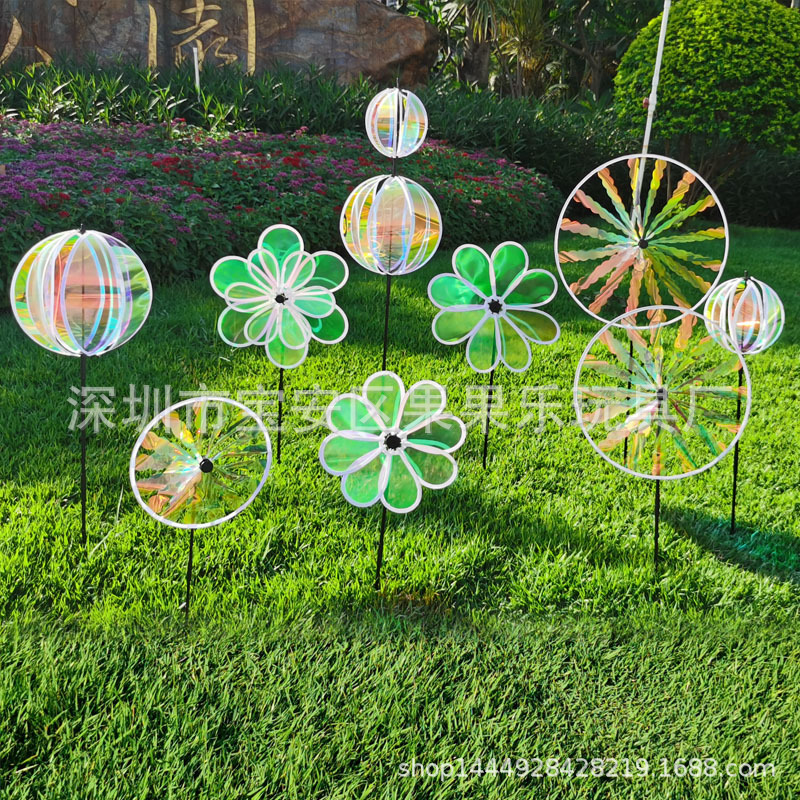 八葉のまぶしい風車の卸売りの観光地区のビルの挿し込み地の屋外の装飾の二重の六葉の色とりどりの膜の太陽の花の風車