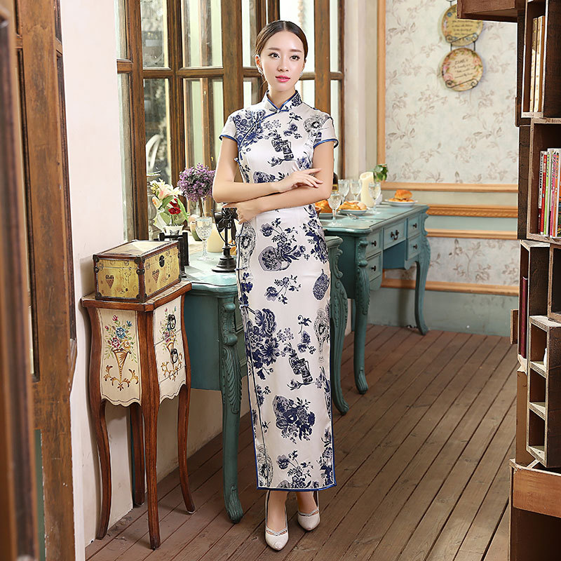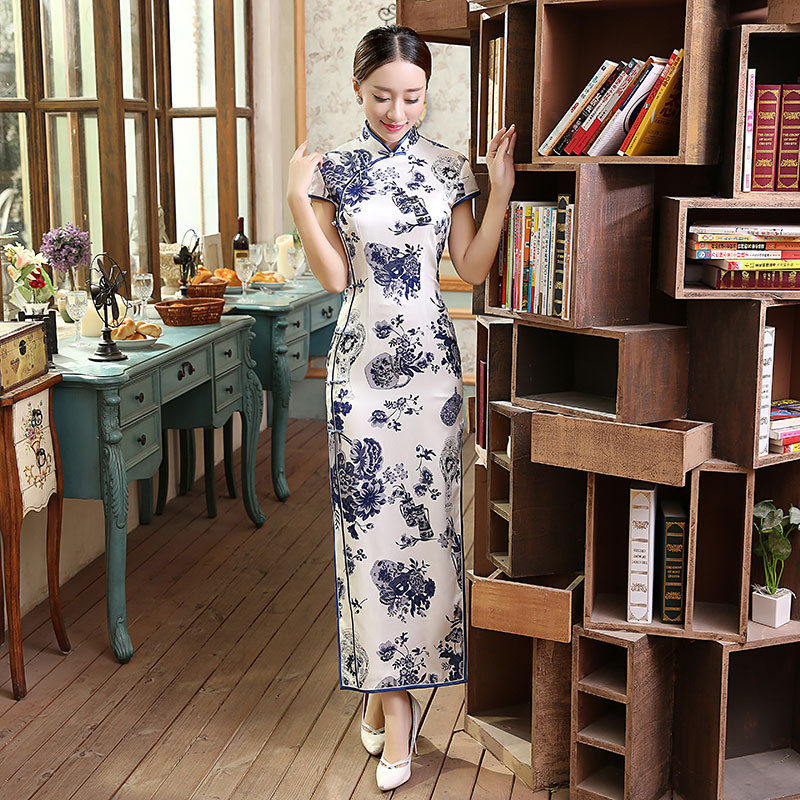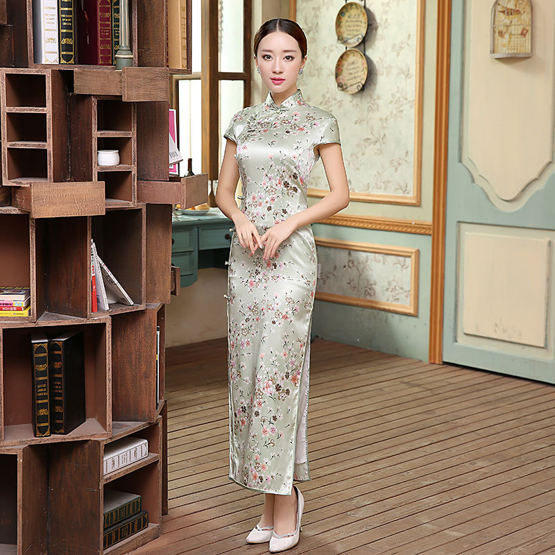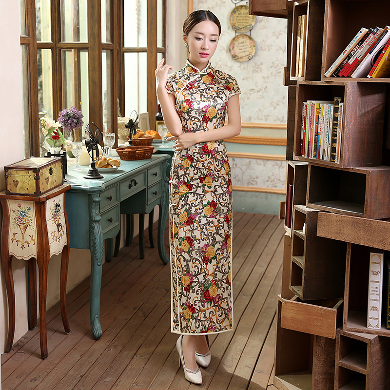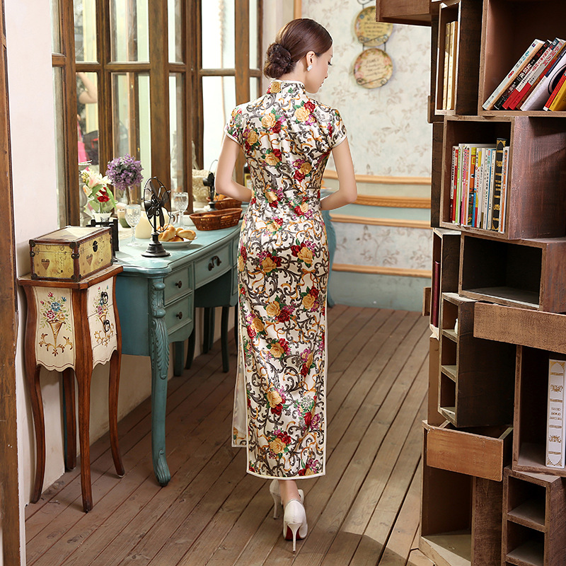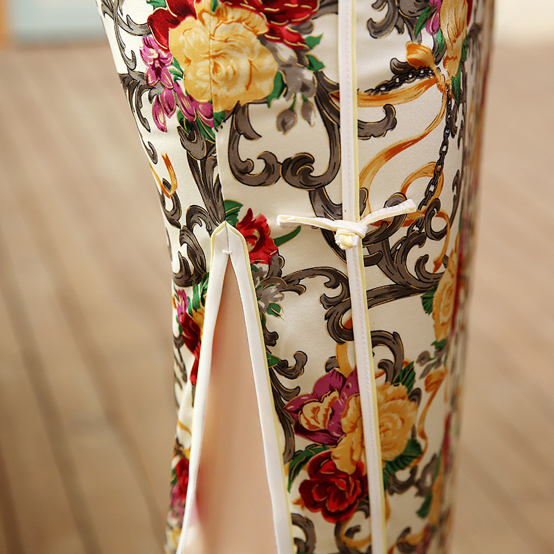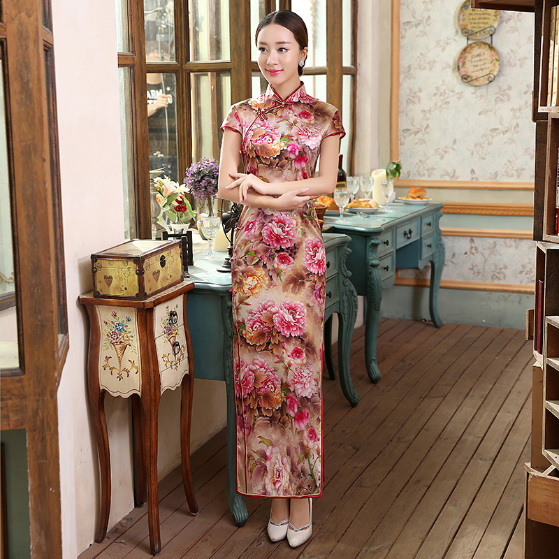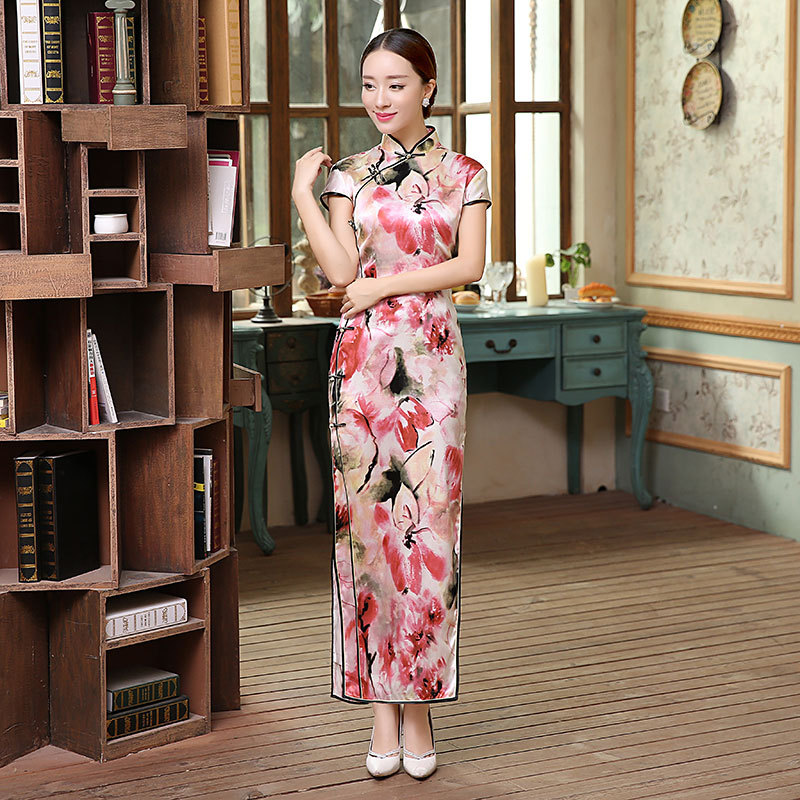 面料:高档数码喷绘弹力缎桑蚕丝面料,亲肤柔软的雪纺内衬,尽显高档旗袍的魅力,后背隐形拉链款,真丝旗袍非常养肤,入手柔爽,顺滑,有着良好地吸湿,散湿和透气性能,可以保皮肤滋润,光滑。