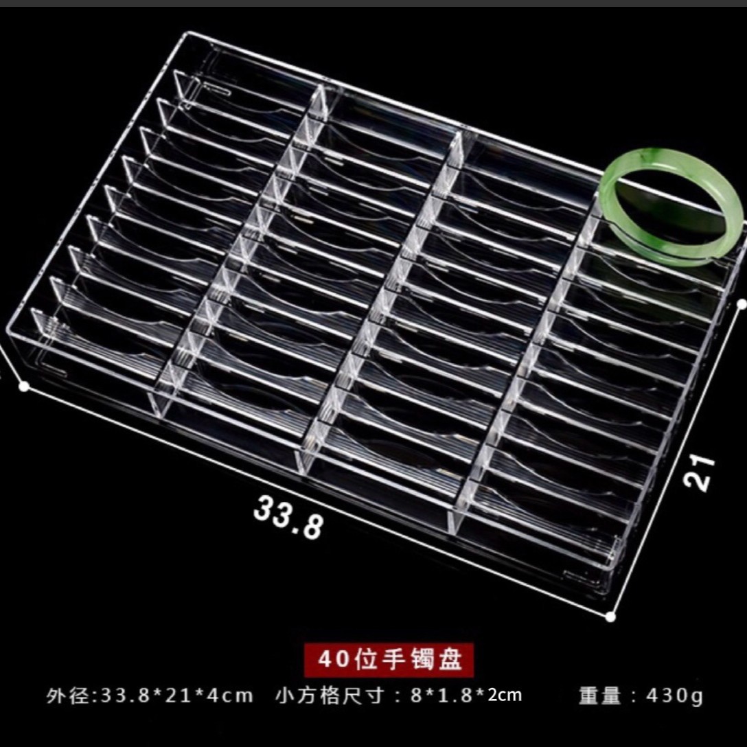 40位手镯盘小号(槽宽1.8cm):长宽高33.5*20.7*4cm,每个小格长宽高8.1*1.8*2.7cm,槽宽约1.8cm,净重约418g 。