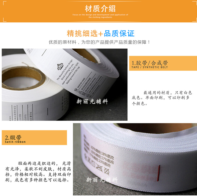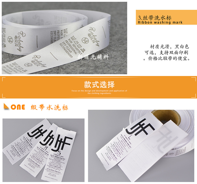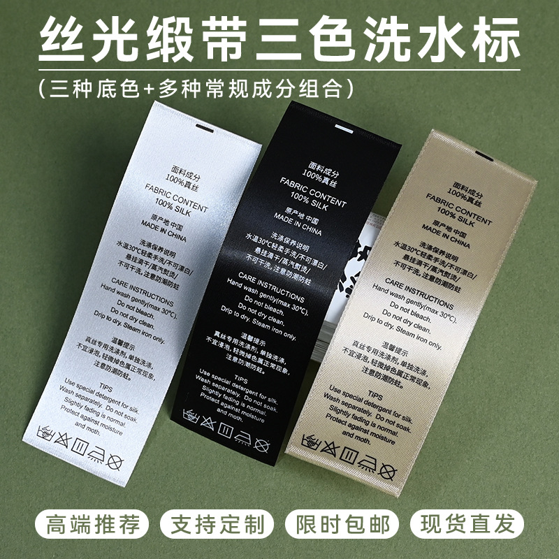 スポットロングウォッシュラベル両面高密度ブラックホワイトゴールドサテンリボンユニバーサル衣類ホームテキスタイル中国語と英語のウォッシュラベルメーカー