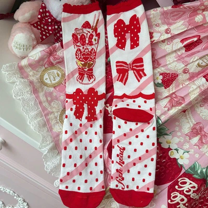 原创草莓芭菲冰淇淋中筒袜日系蝴蝶结秋冬波点花边袜中筒女袜子