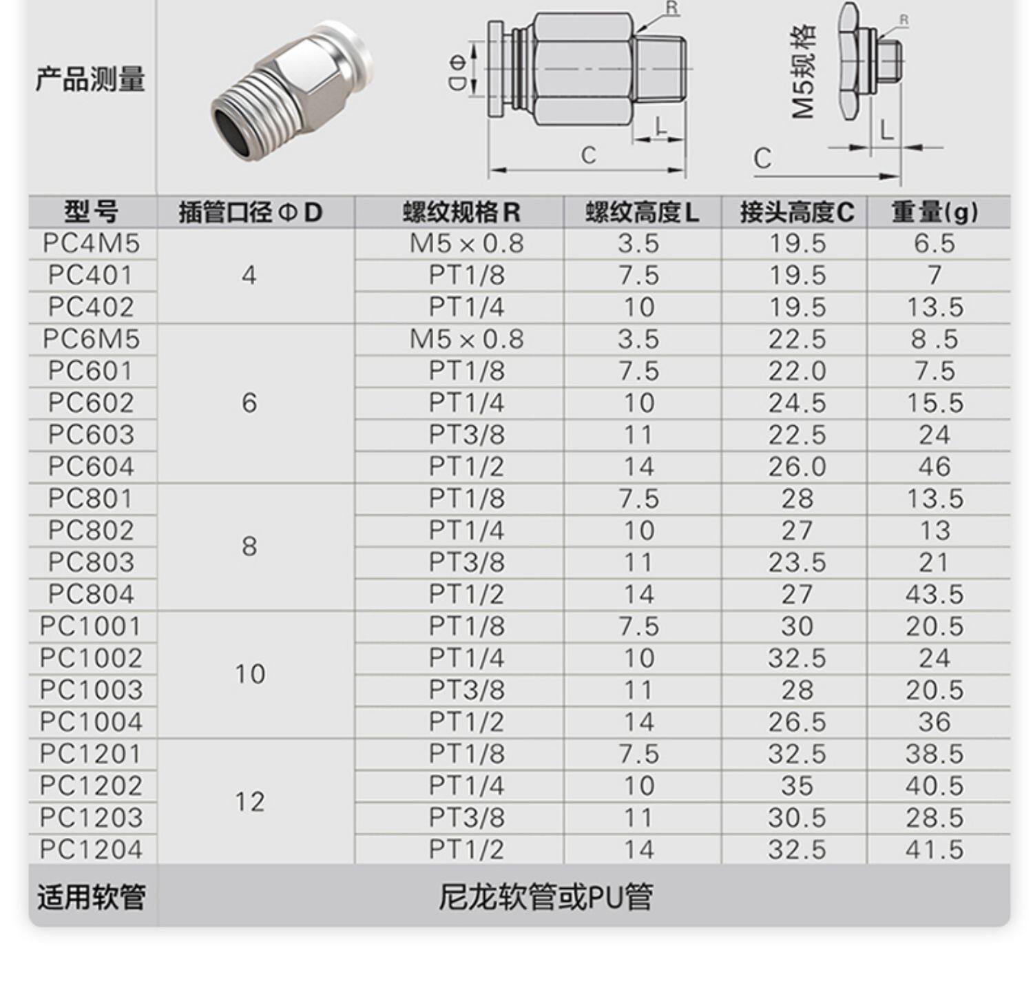 ストレートねじ気管エアクイック継手pc 4/6/8/10/12/16-m 5/01/02/03/04