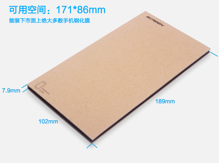 可用空间:171×86mm( 苹果5.5/5.8/6.1/6.5寸 钢化膜可以装下,请参考此可用空间尺寸)