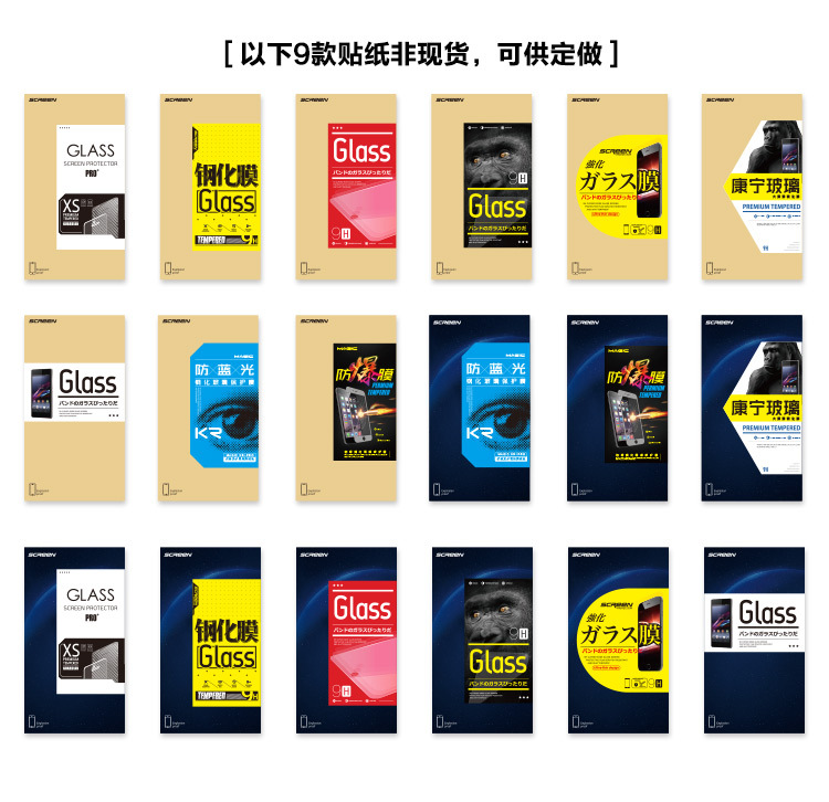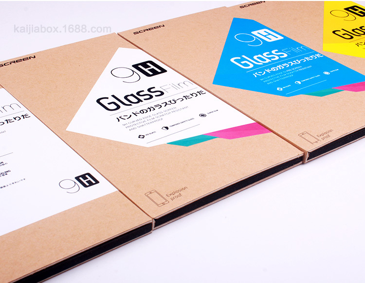 支持铠甲原创设计,新款式牛皮纸钢化膜包装纸盒,简约大气牛皮纸包装,款式新颖独特,材料采用400克高级美牛,每个细节都用心设计,颜色搭配时尚高档,尽显大牌气场,热销欧美、日韩、香港台湾等市场。独特的设计预留大空间给各大品牌定制,不干胶起订量500张起订,即可拥有自己的品牌包装、高定、走起...欢迎订购。