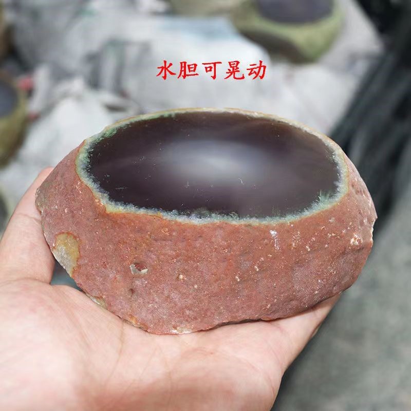 火山爆发时先形成玛瑙的空洞,由于外壳封闭不严或有 及小油孔,地下水向内渗入,后期外壳又被钙质或泥质物包裹,甚至有的胶结得十分坚硬,里面的水很难泄漏出来,也就形成了水胆玛瑙。大部分水胆玛瑙属于这种类型,其特点胆内水量多。