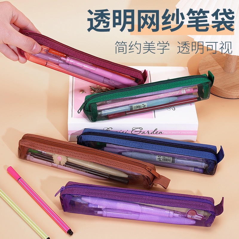 简约透明网纱笔袋收纳袋学生考试专用便携笔袋方形复古色文具袋