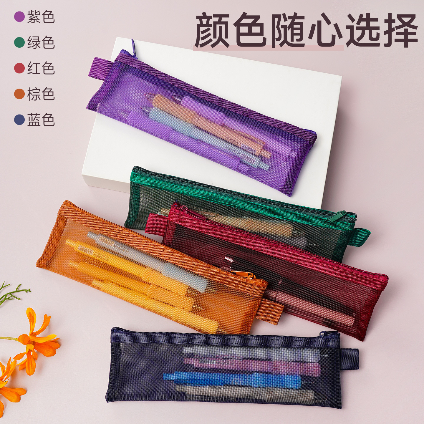 笔袋复古色透明网纱笔袋小号双层网格小众款文具袋便携拉链考试袋