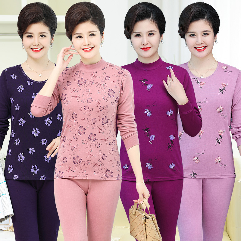 お母さんの純綿の秋の服の秋のズボンのスーツの女性の中高年の保温の下着の薄い金の大きいサイズのライカの綿の秋の服の高襟