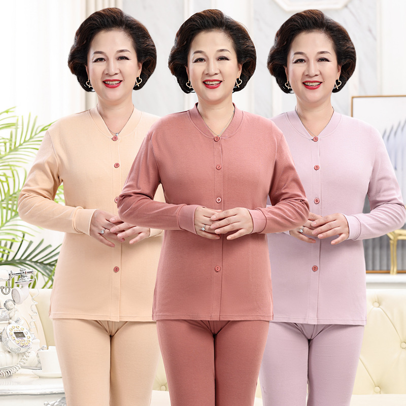 老人纯棉立领开衫妈妈秋衣秋裤套装女中老年人薄款打底棉毛衫开襟