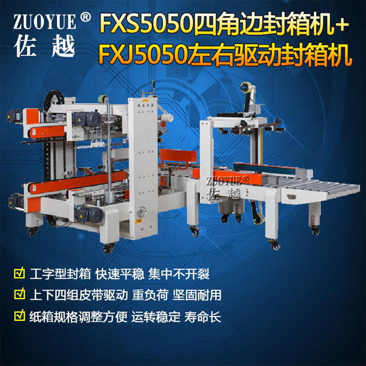 型号:FXS5050四角边全自动封箱机+FXJ5050B左右驱动封箱机如下图: