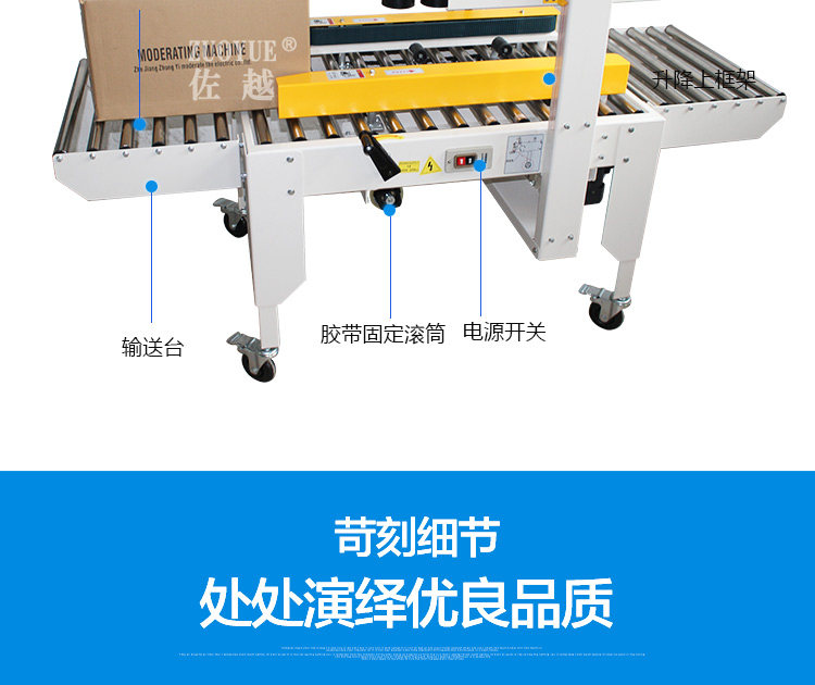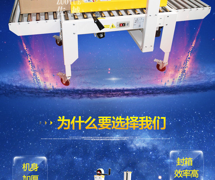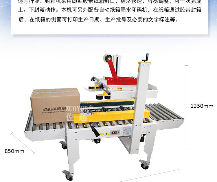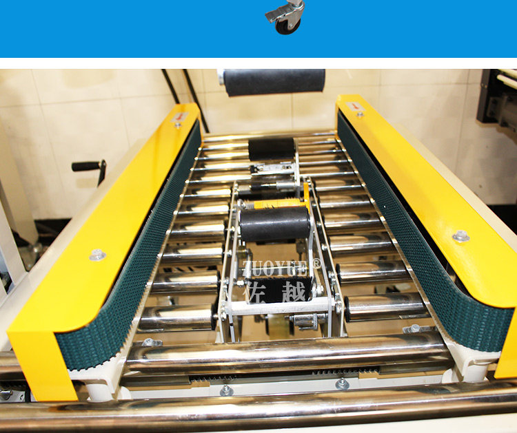 型号:QXJ5050全自动胶带封箱机(气动封箱机)采用气动方式进行全自动包装,克服了手动、半自动包装而带来的速度慢及质量不稳定的弊病;符合不同包装箱,无需调整,即可自动适应 ;根据包装箱材质的不同,可对其封合压力进行调整。既可单机作业,也可与流水线配套使用。本气动封箱机尤其适用于纸箱规格不一的连续封箱,广泛应用在家用电器、纺织、食品、百货、医药、化工等行业。