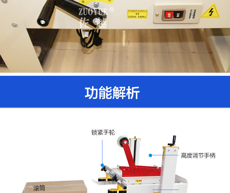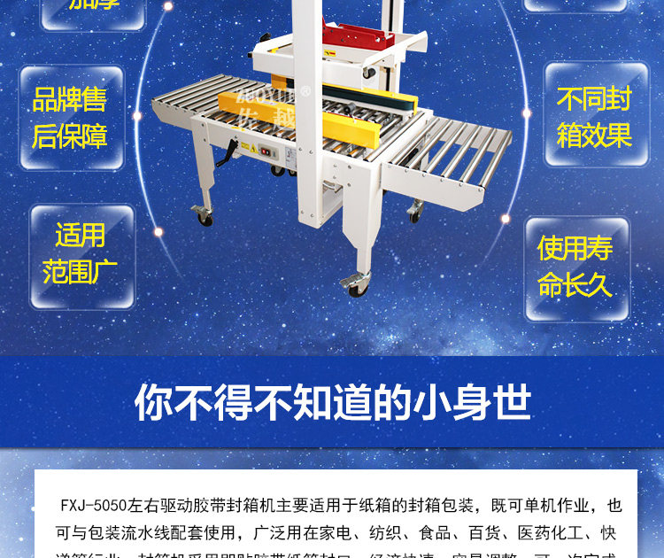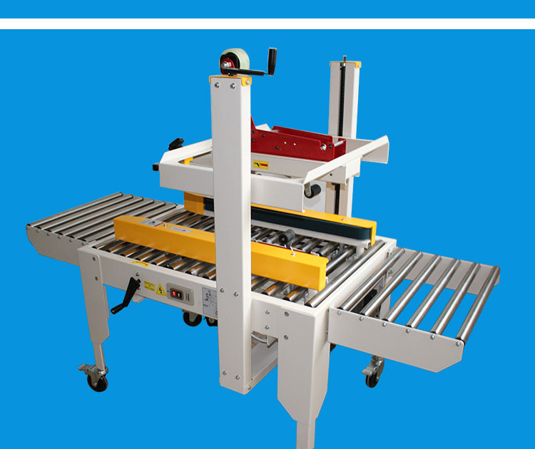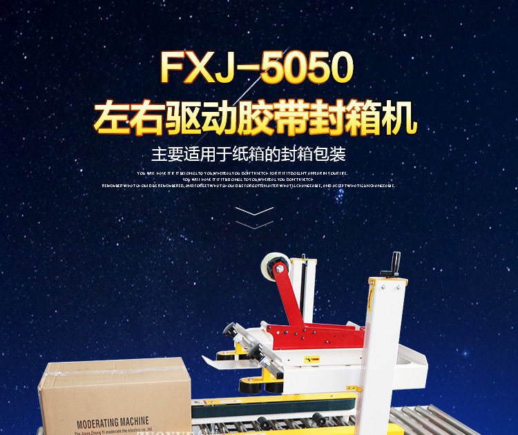 型号:FXJ-6050上下驱动胶带封箱机主要适用于纸箱的封箱包装,即可单机作业,也可与流水线配套使用,广泛应用在家用电器、纺织、食品、百货、医药、化工、快递等行业。本款封箱机适用于纸箱规格一致的批量化作业,一次性调节好纸箱高度和宽度后,连续作业即可,操作简单,维护方便,即降低了工人的劳动强度,又提高了工作效率。本机可另外配备自动纸箱墨水印码机,在纸箱通过胶带封箱后,在纸箱的侧面可打印生产日期、生产批号及必要的文字标注等。