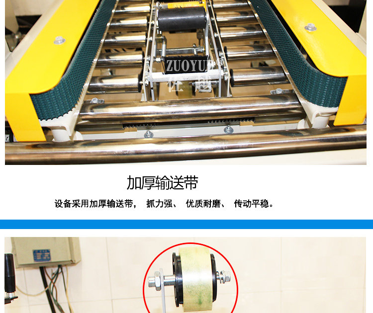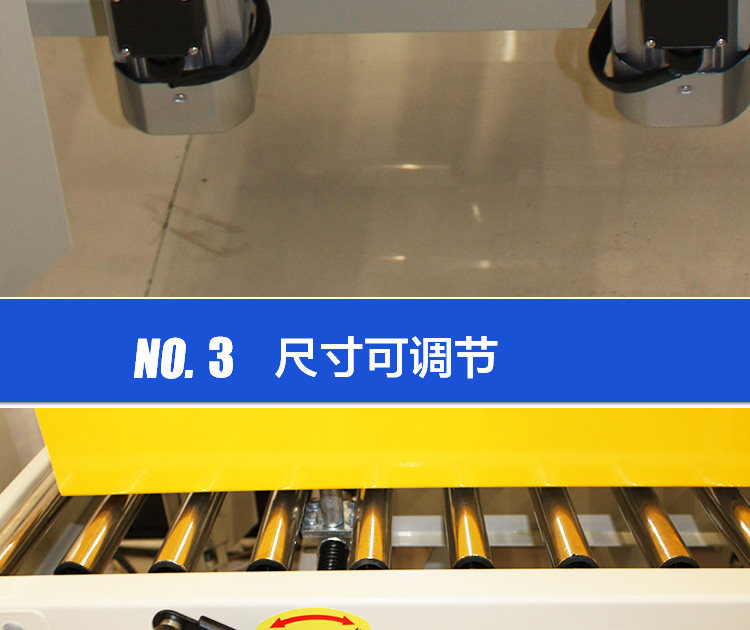 型号:FXJ5050Z全自动折盖胶带封箱机能对纸箱竖起的四个上盖自动折平并自动进行胶带封箱,是一台适合流水线使用的效率高的机型。当箱体规格较多时,全自动折盖封箱机能自动调整不同规格纸箱之高度与宽度,自动定位,顶部自动折合,自动适时输送不用人手看管,适合接合全自动无人化包装线。采用侧边驱动形式,自动校正送箱、调整、运转平稳。气动式折盖机构,自动宽窄高低调节机构,高强度的结构设计,使得该机型性能可靠,能适应生产线连续的繁重的封箱工作。另外,追加的金属框外罩使得设备更加安全。