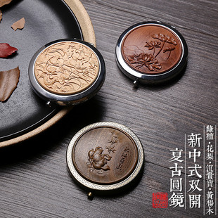 | 精雕檀木化妆镜绿檀便携折叠随身黄杨木花梨梳妆镜红木圆形小镜子 | |