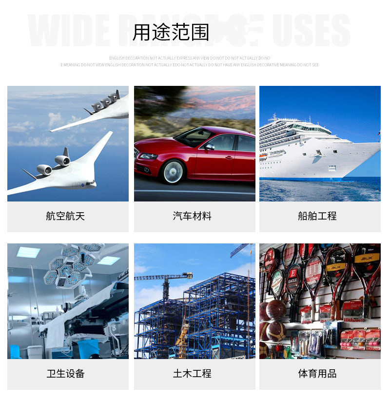 適用範囲 運動器材、工業、建築、レーダーカバー、ロケット、ヨット、釣竿など