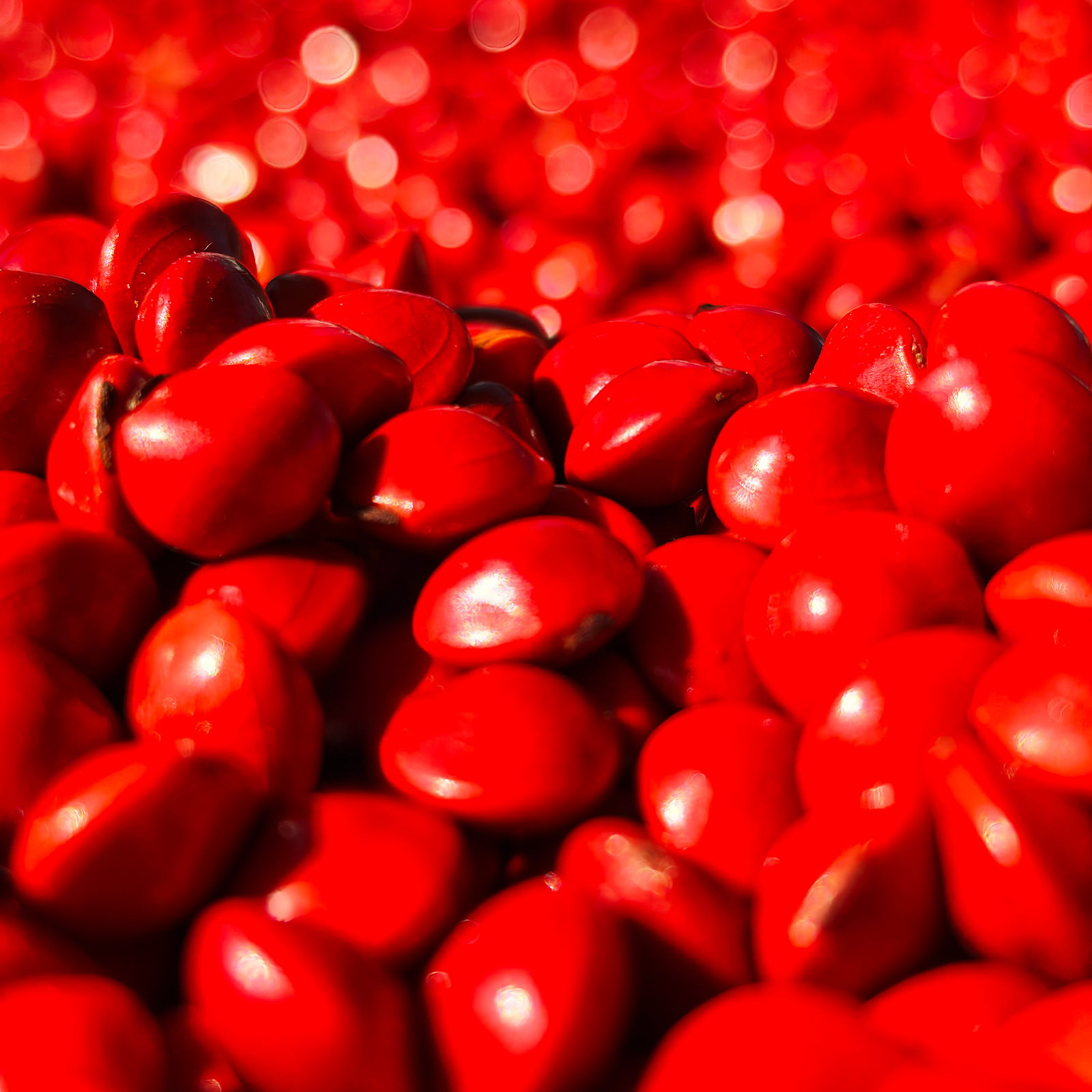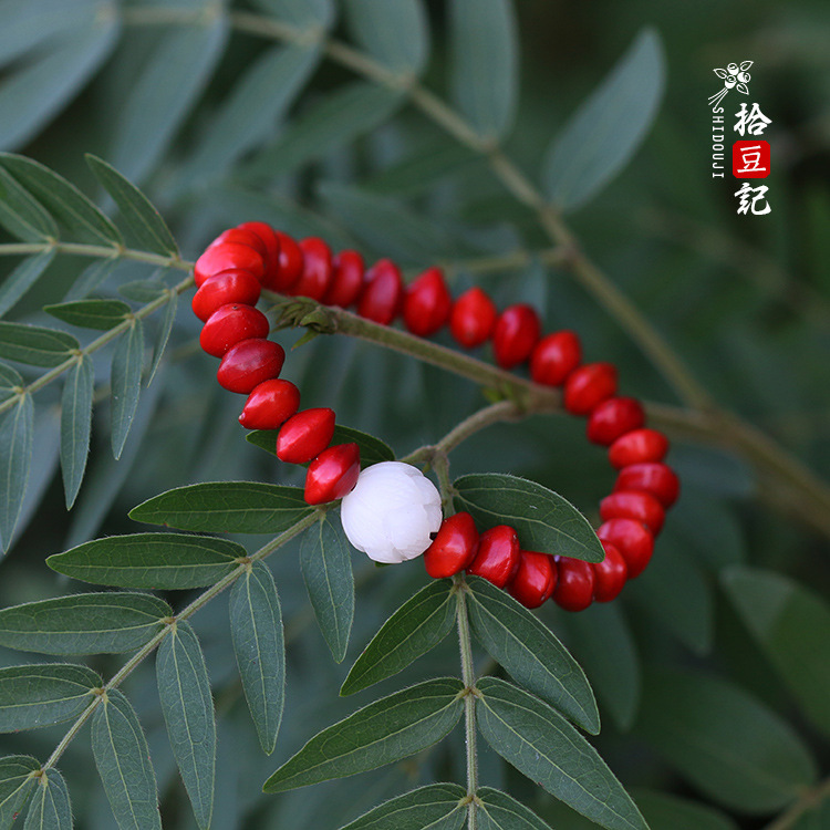 剥开一个豆荚,呈现的是一颗颗鲜脆欲滴的还未成熟的红豆,成熟以后变红(如下图),天然长成的红色,不用处理,不用抛光,豆子本身就光滑亮丽。